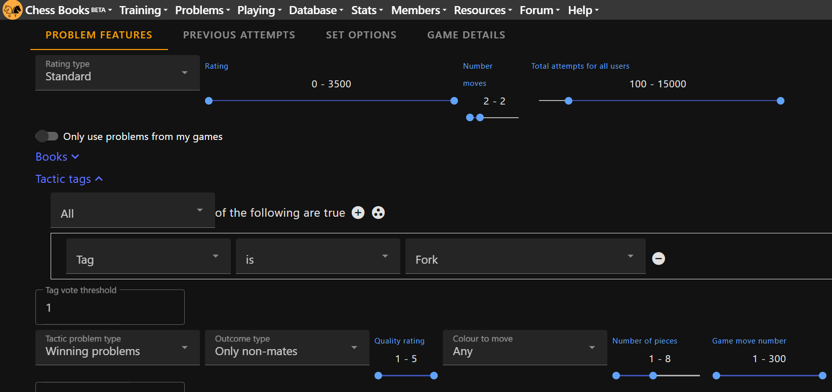 Also, when setting up a custom set of puzzles on chesstempo I am very aware of my strenghts and that I leave them out in my custom set. I do not want to train mates, puzzles with more than 10 pieces (=endgame) and puzzles under three moves.